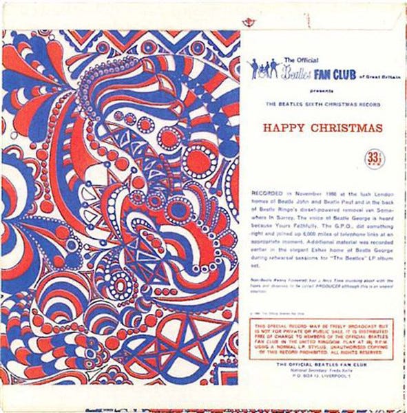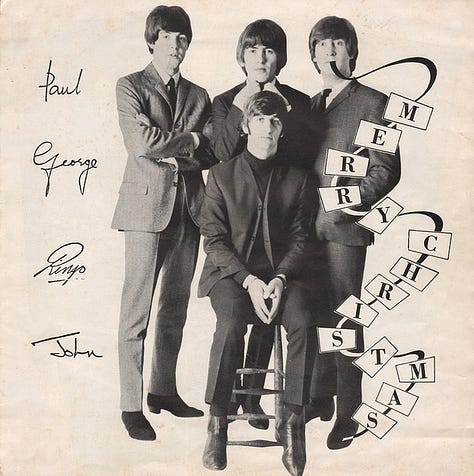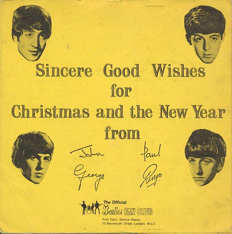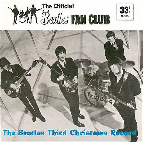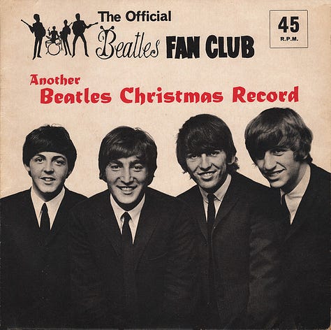 If you’re a hardcore Beatle nerd like me, then you’ll probably be familiar with their annual Christmas records —> five- to eight-minute recordings made between sessions, pressed on cheap vinyl flexi disc, and sent to their fan club members every year from 1963 to 1969. To play them in sequence is like making a short album that is also a kind of shadow history of the band. I’m only partly kidding when I say that it’s my favorite Beatle album.