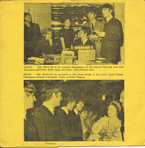 The first three Christmas records are all artifacts of the Beatlemania years. They address the fans directly — “you’ve stayed loyal, haven’t you?” says Ringo with the perfect mix of warmth and irony — and they are obviously reading from, and deforming, scripts written for them by their publicist Tony Barrow. Paul: “hope you’ve enjoyed listening to the records as much as we’ve loved melting them.” This was an extension of the banter made famous in their press conferences and then adapted in the Hard Day’s Night movie — a playful rapport that was both public and private (“we talk in code to each other as Beatles,” Lennon would later say1), and resembles the riffs and verbal jamming that would later distinguish the Firesign Theatre’s radio programs, as with their travestying performance of the “Golden Ring Club” that I discussed a few weeks ago.
