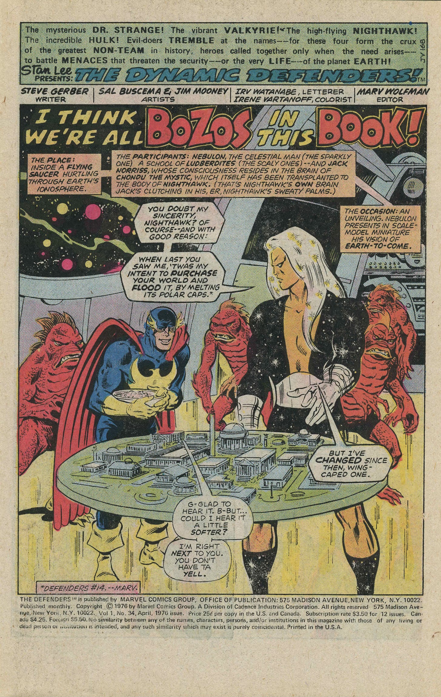 Written by Steve Gerber, and illustrated by Sal Buscema and Jim Mooney. In the story, the Nebulon takes the form of a science nerd who recruits Earth inhabitants to a “Free Seminar in Celestial Mind Control” at the Park Plaza Hotel as a part of his evil plan to remake the world. With their Defender colleague Nighthawk already (for the moment) reduced to a zombie, Dr. Strange, the Incredible Hulk, and Valkyrie disguise themselves as Bozos and interrupt the event, revealing Nebulon’s true identity — and not a moment too soon!