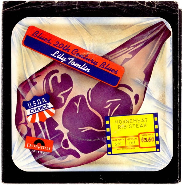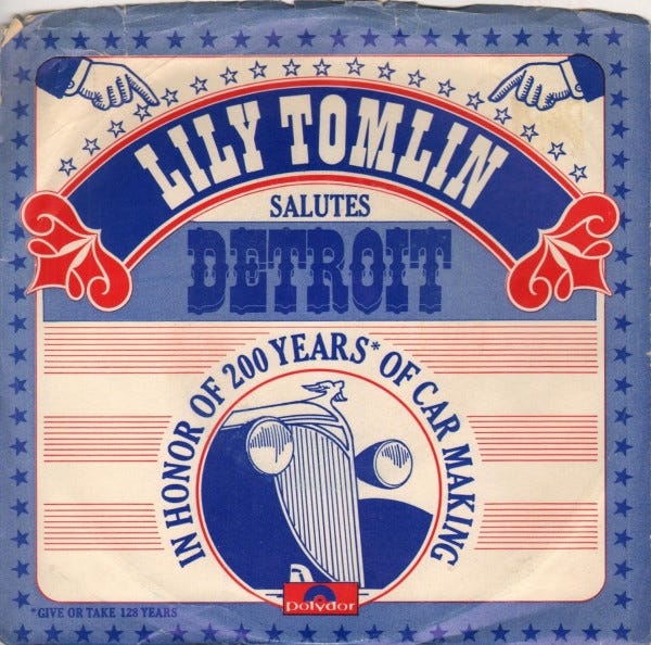 Because Lily Tomlin is apparently capable of doing anything, recordings are only a small part of her career (I especially recommend her 1975 LP Modern Scream). Neither needing nor exceedingly interested in rock music, Tomlin nevertheless released two non-album musical singles in the early seventies, both of which seem very interesting (I haven’t been able to find them online). The first was a 1973 cover of Noël Coward’s grimly comic “Twentieth-Century Blues” (1931), its sleeve displaying a deli-wrapped piece of horse meat. That was followed by “Detroit City,” a Motown-styled ode to her hometown that expresses defensive outrage at scaremongering discourse about the post-’67 Motor City, while at the same time managing jokes about its pollution, poverty, and strawberry milkshakes. Tomlin performed a version of the song (with dance moves) on one of her Emmy-winning television specials in 1975. The Motown label had moved to LA three years earlier.