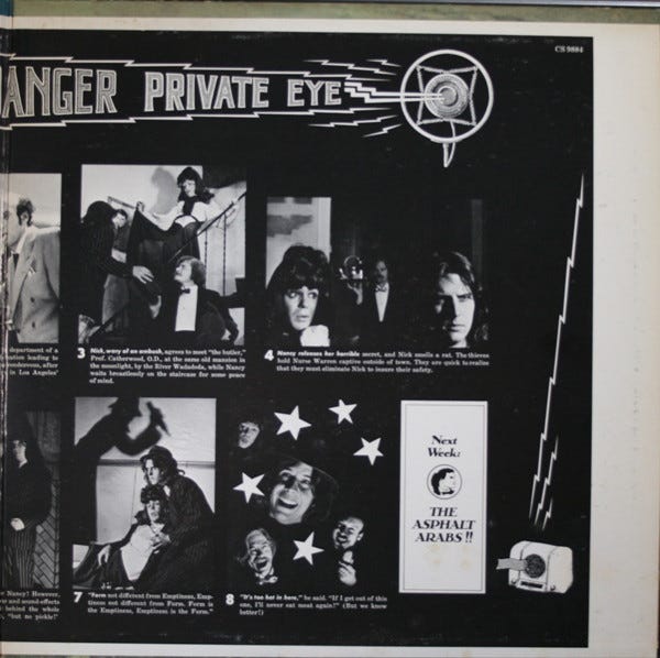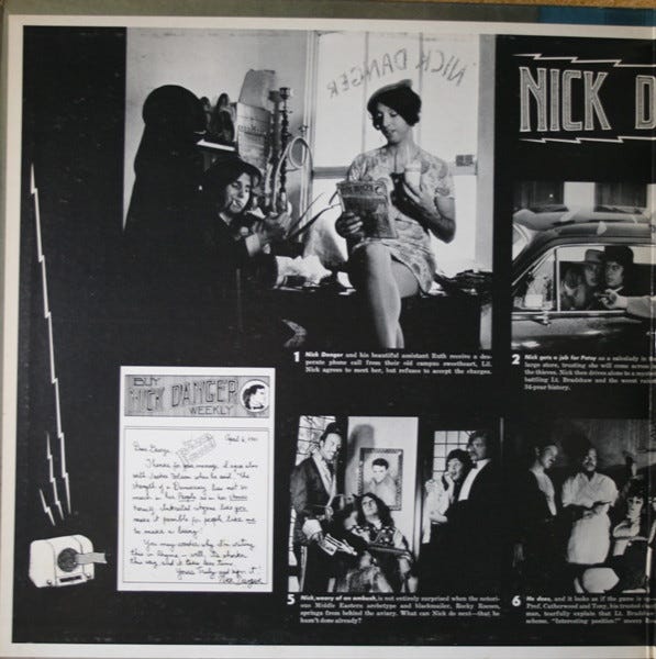 Today we’re finally flipping over to the second side of How Can You Be in Two Places at Once When You’re Not Anywhere at All. Though the first side of How Can You Be is as far out as anything Firesign ever did, the flip side was much more conventional, a parody of old radio detectives called “The Further Adventures of Nick Danger (Third Eye).” Foregoi…